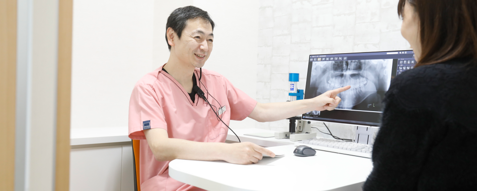 1回目の診療では、お口の状態を診察してインプラントが可能か、可能であれば期間と費用はどのくらいかをお話します。今までの症例もお見せしながら患者様の希望や必要性を伺い、今後の方向性をご相談します。