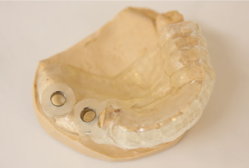 人工歯根と骨の結合を確認します。 インプラント部分を含めた口内全体を型取りして、人工の歯の作成に取りかかります(作成には1~2週間かかります)。